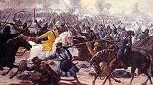 - Battle of Sarsa (1704), against the Mughal army led by general Wazir Khan; the Muslim commander had conveyed Aurangzeb's promise of a safe passage to Guru Gobind Singh and his family in early December.[63] However, when the Guru accepted the offer and left, Wazir Khan took captives, executed them and pursued the Guru.[65] The retreating troops he was with were repeated attacked from behind, with heavy casualties to the Sikhs, particularly while crossing the Sarsa river.[65]