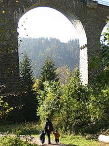 The great importance of the Höllental today for long-distance traffic crossing the relatively low-lying Hinterzarten saddle (about 910 m) was only achieved at significant cost. Initially, the cart track through the Wagensteige ("Wagon Ascent")[1] valley to the north was more important. But by the 12th century, another track, the Falkensteige ("Hawk Ascent"), had been built by the dukes of Zähringen from Freiburg im Breisgau to Donaueschingen, through what was then called the Falkenstein ("hawk stone") Valley (Falkensteiner Tal), the present-day Höllental. The track was guarded at the exit to the narrow pass by the Falkenstein Castle ("Hawk Stone Castle"), but was later threatened, nevertheless. Not until the coach and the large bridle train of Marie Antoinette, which was to bring her to her future husband, the subsequent Louis XVI of France, had to traverse the route, was the track developed into a road. The Falkenstein Valley achieved fame again during the retreat of French troops under General Moreau in 1796, and was referred to as the Val d'enfer ("Hell Valley"). As early as 1691, Emperor Leopold I had described the present-day Hirschsprung as die Höll ("hell", formerly also "hollow"), when he reviewed the defence of routes through the Black Forest. Even the name of the Ravenna ravine had French or other Romanic origins; it is related la ravine. The term arose considerably earlier because it was already in use by 1560.[2] During subsequent work on the route, the gorge at Hirschsprung was successively blasted open. The level of traffic on the present-day B 31 has resulted in plans to replace the main road through Falkensteig, the gorge, and the bends at Höllsteig by tunnels.