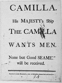 Camilla captured several merchantmen in late 1777 or early 1778. On 15 November she captured the sloop Admiral Montague,[8] sailing from Hispaniola to Rhode Island with a cargo of molasses and coffee.[2] That same day, she captured Chance, Thomas Bell, Master, which was sailing to Georgia with a cargo of flour and rum.[2] Lastly, on 14 March 1778, Camilla captured Polly, William Thompson, Master, which was sailing to Surinam in ballast.[2][8]