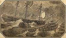 As the hurricane lessened and the seas became a little calmer, the crew was able to get a sail under Centaur, and use her hawsers to lash it to her, much reducing the leaks and bracing her shattered frame.[30] To help keep Centaur afloat, the crew also threw all but a dozen or so guns overboard.[29] The 74-gun third rate HMS Eagle was then able to tow Centaur into Halifax.[29] There Commissioner John Inglefield, who had been captain of the previous Centaur when she foundered after the Atlantic hurricane of 16–17 September 1782, greeted her.[32][Note 3]