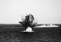On 14 September Force H was recalled to the UK to begin preparations for the invasion of France, but Warspite and Valiant were detached to provide support for Allied forces at Salerno.[86] Although the Italians had surrendered, the Germans had anticipated this and moved forces into position to block the Allied landings. The American forces near Battipaglia were in a precarious situation following German counter-attacks.[95] After arriving off Salerno on 15 September, Warspite bombarded an ammunition dump and other positions around Altavilla Silentina, demoralising the German forces and providing time for Allied reinforcements to arrive.[96] Overnight the fleet came under intense air attack, but she was able to continue bombardment duties the next day. However, early in the afternoon she was attacked by a Luftwaffe squadron of Focke-Wulf Fw 190 fighter bombers and then, from high altitude, by three Dornier Do 217 bombers from KG 100 armed with an early guided missile, the Fritz X.[97] She was hit directly once; a second near-miss ripped open the torpedo bulges while the third missed altogether. The missile that did hit her struck near the funnel, cutting through her decks and making a 20-foot hole in the bottom of her hull, crippling her as it did so.[98] Although the damage had been considerable, Warspite's casualties amounted to only nine killed and fourteen wounded.
