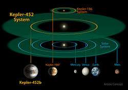 - ↑ Jenkins, Jon M.; Twicken, Joseph D.; Batalha, Natalie M.; Caldwell, Douglas A.; Cochran, William D.; Endl, Michael; Latham, David W.; Esquerdo, Gilbert A.; Seader, Shawn; Bieryla, Allyson; Petigura, Erik; Ciardi, David R.; Marcy, Geoffrey W.; Isaacson, Howard; Huber, Daniel; Rowe, Jason F.; Torres, Guillermo; Bryson, Stephen T.; Buchhave, Lars; Ramirez, Ivan; Wolfgang, Angie; Li, Jie; Campbell, Jennifer R.; Tenenbaum, Peter; Sanderfer, Dwight; Henze, Christopher E.; Catanzarite, Joseph H.; Gilliland, Ronald L.; Borucki, William J. (23 July 2015). "Discovery and Validation of Kepler-452b: A 1.6 R⨁ Super Earth Exoplanet in the Habitable Zone of a G2 Star". The Astronomical Journal. 150 (2): 56. arXiv:1507.06723