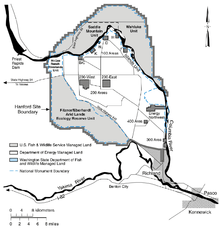The Hanford Site occupies 586 square miles (1,518 km2)—roughly equivalent to half of the total area of Rhode Island—within Benton County, Washington.[2] This land is closed to the general public. It is a desert environment receiving under 10 inches of annual precipitation, covered mostly by shrub-steppe vegetation. The Columbia River flows along the site for approximately 50 miles (80 km), forming its northern and eastern boundary.[12] The original site was 670 square miles (1,740 km2) and included buffer areas across the river in Grant and Franklin counties.[13] Some of this land has been returned to private use and is now covered with orchards and irrigated fields. In 2000, large portions of the site were turned over to the Hanford Reach National Monument.[14] The site is divided by function into three main areas. The nuclear reactors were located along the river in an area designated as the 100 Area; the chemical separations complexes were located inland in the Central Plateau, designated as the 200 Area; and various support facilities were located in the southeast corner of the site, designated as the 300 Area.[15]