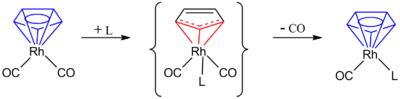 Here the η5-cyclopentadienyl changes to an η3-cyclopentadienyl, giving room on the metal for an extra 2-electron donating ligand 'L'. Removal of one molecule of CO and again donation of two more electrons by the cyclopentadienyl ligand restores the η5-cyclopentadienyl. The so-called indenyl effect also describes changes in hapticity in a substitution reaction.