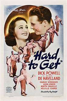 Hard to Get is a 1938 American romantic comedy film directed by Ray Enright and starring Dick Powell and Olivia de Havilland.[1] Written by Jerry Wald, Maurice Leo, and Richard Macaulay, the film is about a spoiled young heiress who tries to charge some gasoline at an auto court and is forced by the attendant to work out her bill by making beds and cleaning rooms. Resolving to get even, she pretends to have forgiven him, and then sends him to her father to get financing for his plan to develop a string of auto courts across the country, knowing he will only be wasting his time. Hard to Get was released by Warner Bros. Pictures in the United States on November 5, 1938.[2]