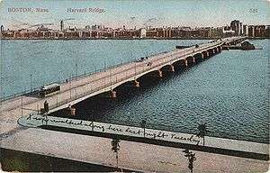 After several legislative attempts fraught with antipathy on the part of Boston, it was built jointly by Boston and Cambridge, Massachusetts, between 1887 and 1891.[7] It originally included a swing span. The bridge was revised over the years until its superstructure was completely replaced in the late 1980s due to unacceptable vibration and the collapse of a similar bridge. The bridge was named for the Reverend John Harvard.[8]