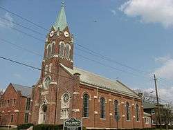 A portion of the neighborhood, roughly bounded by 10th Street, Belleview Place, Walnut Street. and Concord Street, is listed on the National Register of Historic Places as the Haughville Historic District, a national historic district.[1] The district encompasses 329 contributing buildings. This area is the site of the former housing project, Concord Village. The area was first settled in the 1830s, when it became home to a number of merchants, whose small shops sprouted up near the west landing of the then brand-new Washington Street Bridge over the White River. By the 1880s, encouraged by the bridge and proximity to a number of new railroad lines, the town became home to a number of Irish, German, and later Slovene immigrants, many of whom worked in the neighborhood's two iron foundries or in meat-packing plants. The area was incorporated in 1883 and annexed by Indianapolis in 1897. By 1900, almost half of the neighborhood's inhabitants were Slovene, many of whom attended St. Anthony's Catholic church. Due to tensions with the largely Irish population at St. Anthony's parish, the Slovenian community petitioned Vicar General Denis D. O'Donaghue to build their own church. Permission was received and Holy Trinity Slovenian Catholic Church began in April 1906. Holy Trinity is the only Slovenian Catholic in the United States and is also an international historical landmark. Holy Trinity eventually became home to a school, a number of local organizations and a Slovene community center. The church closed its doors in 2015. Indeed, the neighborhood's Slovene past is one of the reasons that Indianapolis has a sister-city relationship with Piran, Slovenia. The Slovenian National Home was formed in 1906 in a basement of a home across the street from Holy Trinity Slovenian Catholic Church as a place to congregate outside of church and home. Today the "Nash" is located at 2717 W. 10th street where it has been a pillar of the community since 1940. The National Home is a private club for Slovenian people, their descendants, and friends.[3]