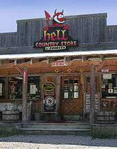 There are two theories for the origin of Hell's name. The first is that a pair of German travelers stepped out of a stagecoach one sunny afternoon in the 1830s, and one said to the other, "So schön hell!" (translated as, "So beautifully bright!") Their comments were overheard by some locals and the name stuck.[3] Soon after Michigan gained statehood, George Reeves was asked what he thought the town he helped settle should be called and replied, "I don't care, you can name it Hell for all I care." The name became official on October 13, 1841.[3] The second theory is tied to the "hell-like" conditions encountered by early explorers including mosquitos, thick forest cover, and extensive wetlands.[3] It has frequently been noted on lists of unusual place names.[4]