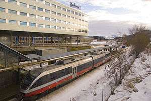 The main passenger service on the section from Hell to Steinkjer is the Trøndelag Commuter Rail. Operated by the Norwegian State Railways, it runs at a fixed hourly headway—with additional rush-hour services—between Lerkendal Station in Trondheim and Steinkjer,[90] calling at 13 stations on the Hell–Sunnan Line. Travel time from Steinkjer is 24 minutes to Verdal, 37 minutes to Levanger, 1 hour and 24 minutes to Stjørdal and 2 hours and 4 minutes to Trondheim.[90] The services are operated with Class 92 diesel multiple units.[91]