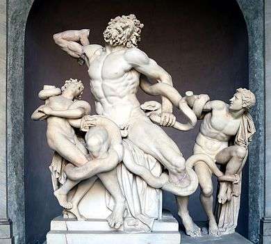 Discovered in Rome in 1506 and seen by Michelangelo,[24] Laocoön, strangled by snakes, tries desperately to loosen their grip without affording a glance at his dying sons, is attributed by Pliny the Elder to the Rhodian sculptors Agesander, Athenodoros, and Polydorus.[24]