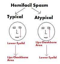 The first sign of hemifacial spasm is typically muscle movement in the patient's eyelid and around the eye. It can vary in intensity.[9] The intermittent twitching of the eyelid, which can result in forced closure of the eye which gradually spreads to the muscles of the lower part of the face (Typical form- See Image). In atypical form the spasms start in the cheekbone area and spreads to the eyelid.[2] Ultimately, all the muscles on that side are affected, nearly all the time. This sometimes causes the mouth to be pulled to the side. Experts have linked hemifacial spasm to facial nerve injury, Bell's palsy and tumors. Although the most frequent cause is a blood vessel pressing on the facial nerve at the spot where it leaves the patient's brain stem, sometimes there is no known cause. When the affected individual is younger than 40, doctors suspect an underlying cause such as multiple sclerosis.[15]