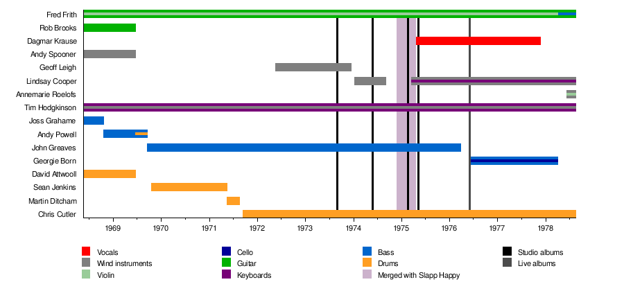 Notes: before Sean Jenkins joined, the band auditioned several other drummers. According to Fred Frith, between 1969 and 1971, the band played more as a trio than with a drummer.[6] From November 1974 to April 1975 Henry Cow merged with Slapp Happy to form one group. The band's final studio album Western Culture was released in 1979 after the group had split up.