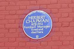 In 2003, Chapman was inducted into the English Football Hall of Fame in recognition of his impact as a manager.[104] An English Heritage blue plaque commemorating Chapman was unveiled in March 2005, at the house in Hendon where Chapman lived from 1926 until his death. Chapman was the first footballer or football manager to be commemorated in this way by English Heritage.[105] In 2004, on the seventieth anniversary of his death, The Sunday Times named him the greatest British manager of all time in a poll.[106]