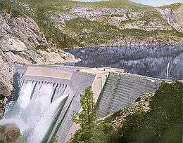 The concrete for the dam was processed in a plant located shortly upstream from the construction site, with sand and rock excavated from abundant alluvial deposits in the Hetch Hetchy valley.[36] This was mixed with cement shipped in on the Hetch Hetchy Railroad and local boulders ranging from 1 ft (0.30 m) to several yards (metres) in diameter to produce a cyclopean construction material for the dam.[36] Beginning in September 1921, the concrete was hoisted up a 375-foot (114 m) tower on the south side of the gorge, from which it could flow down movable chutes by gravity to the construction site. A total of 398,516 cu yd (304,687 m3) of concrete was poured to form a dam standing 226 feet (69 m) above the riverbed and 344 feet (105 m) above foundations.[36] The last concrete was placed in February 1922 and the dam was completed in May 1923. At the time, it was the second tallest dam in the United States, after Idaho's Arrowrock Dam. On May 24, 1923, the reservoir filled for the first time.[36] A peak labor force of five hundred worked on the project,[41] which claimed the lives of 67 men and one woman.[35]