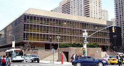 The Martin Luther King Jr. Educational Campus is a five-story public school facility at 122 Amsterdam Avenue between West 65th and 66th Streets in the Lincoln Square neighborhood of Manhattan, New York City, near Lincoln Center. The campus is faced on Amsterdam Avenue by a wide elevated plaza which features a self-weathering steel memorial sculpture by William Tarr.[1] The same steel, called Mayari R, was used by architect Frost Associates in the curtain wall of the building,[1] the interior of which has an arrangement of perimeter corridors with floor-to-ceiling windows, leaving many classrooms on the inner side windowless. The school is across West 65th Street from Fiorello H. LaGuardia High School of Music & Art and Performing Arts.