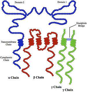 The high-affinity IgE receptor, also known as FcεRI, or Fc epsilon RI, is the high-affinity receptor for the Fc region of immunoglobulin E (IgE), an antibody isotype involved in the allergy disorder and parasites immunity. FcεRI is a tetrameric receptor complex that binds Fc portion of the ε heavy chain of IgE.[1] It consists of one alpha (FcεRIα - antibody binding site), one beta (FcεRIβ - which amplifies the downstream signal), and two gamma chains (FcεRIγ - the site where the downstream signal initiates) connected by two disulfide bridges. It is constitutively expressed on mast cells and basophils[2] and is inducible in eosinophils.