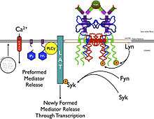 - ↑ Siraganian RP (December 2003). "Mast cell signal transduction from the high-affinity IgE receptor". Curr. Opin. Immunol. 15 (6): 639–46. doi:10.1016/j.coi.2003.09.010. PMID 14630197.