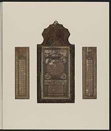 The pocket hilyes were written on a piece of paper, small enough to fit in a breast pocket after being folded in three. The folding lines were reinforced with cloth or leather. Other pocket hilyes were made of wood.[14] Hilyes to be displayed on a wall were prepared on paper mounted on wooden panels, although in the 19th century, thick paper sheets became another medium.[14] The top part of hilyes that were laid on wooded panels were carved and cut out in the form of a crown. The crown part would be richly illuminated and miniatures of Medina, the tomb of Muhammad or the Kabaa would be placed there, together or separately.[15]