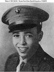 PFC Harold Gonsalves (1926–1945), had enlisted in the Marine Corps Reserve on May 27, 1943 and was called to active duty on June 17, 1943. He was assigned to the 22nd Marines and participated in the assault, capture, and occupation of Engebi and Parry Islands, in the Marshall Islands. PFC Gonsalves accompanied the 22nd Marines to Kwajalein, to Guadalcanal, back to Kwajalein and Eniwetok, then up to Guam in July where he took part in Battle of Guam.