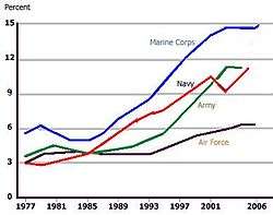 Hispanics (sometimes also referred to as "Latinos"[4]) in the Marine Corps account for the largest minority group of that military institution. Hispanics comprise 18% of enlisted Marines today, up from 15% when the Iraq War began.[5] The United States Marine Corps has implemented an aggressive recruitment program directed towards Hispanics,[6] which is the nation's largest ethnic or minority race (2005 Census).[7] According to the U.S. Census Bureau the estimated Hispanic population of the United States is over 50 million, or 16% of the U.S. population.[8][9] The 2010 U.S. Census estimate of over 50 million Hispanics in the U.S. does not include the 3.9 million residents of Puerto Rico.