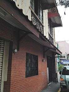 The Perez House is a two-storey apartment-type structure, built between 1931-1932 located in Plaza Hugo.[6] It was originally owned by Jaime S. Perez, an en kargador or tax collector during the pre-war. It is within near proximity to the Santa Ana Church (Manila) and Plaza Hugo, the former center of main activity in Santa Ana, Manila. The ground floor was utilized before as a commercial space, exhibiting ecclesiastical sculptures and art. The second floor was utilized as a residential space for owner/s and bed spacers. At present, the ground floor was still used as a commercial space (sari-sari store) while the second floor was converted into one-room bedroom. This utilization of spaces was an example of adaptive Re-use, least option in Heritage Conservation.