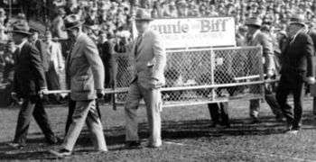 In 1927, the Detroit Zoo acquired ten wolverines from Alaska. Yost struck a deal with the zoo to have two of the wolverines transported to Ann Arbor on football Saturdays.[104][105] The two wolverines were nicknamed "Biff" and "Bennie" and were paraded around Michigan Stadium during football games.[104] Biff and Bennie's first appearance came on dedication day for Michigan Stadium in 1927.[106] As Biff and Bennie "grew larger and more ferocious," Yost joked, "It was obvious that the Michigan mascots had designs on the Michigan men toting them, and those designs were by no means friendly."[104] Accordingly, the practice of bringing Biff and Bennie into the stadium ended after just one season.[104] An article in National Geographic magazine reported that "Yost had not accounted for the rapid growth or the ferocity of the animals, and when his players were no longer willing to carry the wolverines around the stadium, one live mascot, 'Biff,' was turned over to the University of Michigan Zoo so that the students would be able to visit—and be inspired by—him."[105]