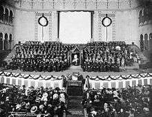In Queen Victoria's latter years, both her Golden and Diamond Jubilees—held in 1887 and 1897 to celebrate the 50th and 60th anniversaries, respectively, of the Queen's accession—were marked with great displays and public ceremonies in Canada, as well as colonial conferences held in the United Kingdom and attended by the prime ministers of the Dominions. For the Diamond Jubilee in Britain, Prime Minister Wilfrid Laurier was invited and Canadian troops partook in Victoria's procession on the day of celebration, 22 June.[57] In Canada, a series of commemorative stamps, the first ever produced by the country, was issued on 19 June and streets were decorated in cities and towns to mark Accession Day and the 22 June public holiday,[58][59] on which fêtes brought Canadians of different ethnicities together.[57][60] On that day, the Queen sent a telegram to all the Dominions, the message arriving in Canada five minutes after being sent from Buckingham Palace.[57]