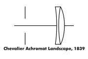 By the end of 1839, Chevalier had created an achromatic version of the meniscus that combined field flattening and chromatic aberration control.[9][10] The lens had the reverse concave flint glass side facing the subject and an f/16 aperture stop at its radius of curvature, making it reasonably sharp over a wide field of about 50°.[11] Reversing the lens did increase chromatic aberration, but this fault could be lessened by adjusting the achromat to bring colors at the blue end of the spectrum into focus to match the blue-sensitive nature of the photographic emulsion.[12] This design was copied by other lens makers. Because of its large flat field over a wide angle of view and its "slow" f/16 aperture (requiring twenty to thirty minutes for outdoor daguerreotype exposures), this lens came to be known as the "French landscape lens" or simply the "landscape lens".