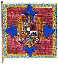 Flags produced in 1873 (24 flags and 10 standards), of which only one, the Firemen’s, survived in 1900, were square, 150 centimeter on each side. In its center was painted, on a maroon background surrounded by a closed wreath of silver laurels, Romania’s middle coat of arms. The monogram of Prince Carol was in the corners, surrounded by a laurel crown, while the flagpole was topped by a metal eagle with the motto “Onóre şi Patria” ("honor and Fatherland") as well as the unit’s number and name.[56] The cavalry flags had canvases of reduced dimensions (45 centimeter), while the decorative elements were embroided and not painted. All these insignia were distributed to the units on 14 October 1874, on the field at Băneasa.[56][60]