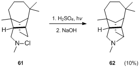 Another example of the construction of a bicyclic amine through the standard Hofmann–Löffler–Freytag methodology is the Waegell's synthesis[32] of azabicyclo[3.2.1]octane derivative 53.