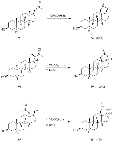 In case of 64 and 66, the five-membered nitrogen ring is formed by attack on the unactivated C-18 methyl group of the precursor (63 or 65, respectively) by a suitably placed nitrogen-centered radical at C-20. The ease of this reaction is due to the fact that in the rigid steroid framework the β-C-18 methyl group and the β-C-20 side chain carrying the nitrogen radical are suitably arranged in space in order to allow the 1,5-hydrogen abstraction to proceed via the six-membered transition state.