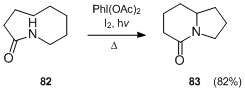 E. Suárez et al.[45] reported that the amidyl radical intermediates, produced by photolysis of medium-sized lactams, e.g. 82 in the presence of PhI(OAc)2 and iodine, undergo transannular hydrogen abstraction to afford intramolecularly funcionalized compounds such as oxoindolizidines 83.