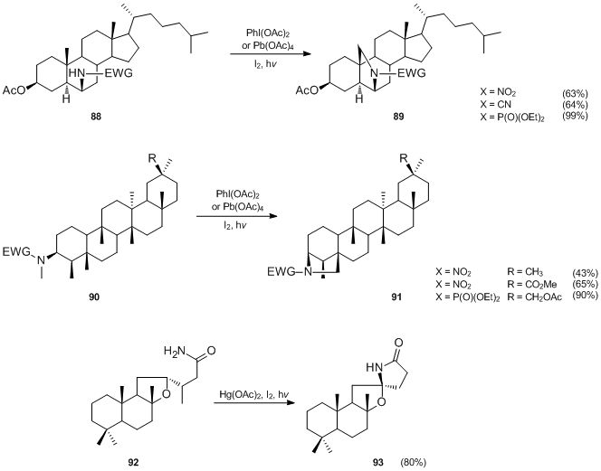 The utility of the Suárez modification of the Hofmann–Löffler–Freytag reaction was demonstrated by its application in synthesis of a number of steroid and triterpene compounds.[25][26][28][29][46] As illustrated below, the phosphoramidate-initiated funcionalizations generally proceed in higher yields than the reactions involving N-nitro or N-cyanamides.