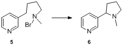 Although the Hofmann–Löffler–Freytag reaction was to become a general and expeditious process for the formation of pyrrolidines, it was not until about 25 years after Hofmann's work that further examples of the reaction appeared in the literature. In 1909, K. Löffler and C. Freytag extended the scope of this transformation to simple secondary amines and demonstrated the synthetic utility of the process as exemplified by their elegant synthesis of nicotine 6 from N-bromo-N-methyl-4-(pyridin-3-yl)butan-1-amine 5.[8][9][10]