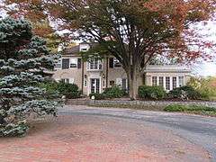 Holladay-Harrington House is a historic estate located at Greenville, New Castle County, Delaware. It was designed about 1927 by noted Delaware architect E. William Martin. It is a 2 1/2-story, three bays wide, stuccoed dwelling in the Colonial Revival style. The house has a hipped roof with wide overhanging eaves, projecting pavilion-like side sun porches, and French doors in all three first floor bays. The property includes a contributing garage, three small greenhouses, driveway pillars, fountain and concrete pool, retaining wall, metal fencing with grape design near greenhouses, and landscape features.[2]
