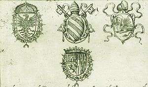 - ↑ The image shown is a reproduction of a 1888 watercolor drawn from a copy of the banner in the Museo Naval in Madrid. F. Javier Campos y Fernández de Sevilla, "CERVANTES, LEPANTO Y EL ESCORIAL"