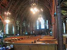 St Mary's Church is the former Cathedral Church of the Anglican Diocese of Auckland. It replaced the earlier Old St Mary's. This wooden Gothic Revival church was designed by the prominent Christchurch architect Benjamin Mountfort and completed in 1897.[2] The building served as the Cathedral Church and principal Anglican church of Auckland until 1973 when the Chancel of Holy Trinity Cathedral, for which the foundation stone was laid in 1957, came into use. In 1982, St Mary's Church was moved across Parnell Road to its present site beside the Cathedral.[3]