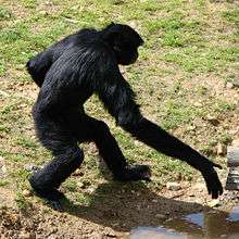 Like many scientists who believed that modern humans evolved "Out of Asia", Dubois thought that gibbons were closest to humans among the great apes.[37] To preserve the proportions predicted by his theory of brain evolution, Dubois argued that Java Man was shaped more like a gibbon than a human. Imagined "with longer arms and a greatly expanded chest and upper body", the Trinil creature became a gigantic ape of about 100 kilograms (220 lb), but "double cephalization of the anthropoid apes in general and half that of man".[38] It was therefore halfway on the path to becoming a modern human.[39] As Dubois concluded his 1932 paper: "I still believe, now more firmly than ever, that the Pithecanthropus of Trinil is the real 'missing link.'"[40]