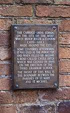 In 1129, Roger de Clinton was appointed Bishop of Lichfield. He built a new cathedral fortified the Cathedral Close and laid out a new town. Finally he constructed a defensive ditch and walls around the city.[1] There were four gates or 'barrs' allowing movement in and out of the city walls, which were closed at 8 or 9 at night and reopened at 7 in the morning.[2]
