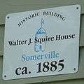 The House at 10 Arlington Street in Somerville, Massachusetts, also known as the Walter J. Squire House, is a well-preserved transitional Italianate/Queen Anne house. The basic 2.5 story, front gable, three bay side entrance layout was fairly typical for Italianate houses in the city, as are the paired cornice brackets and hoods over the windows. The porch, however, has Queen Anne elements, including turned posts and the rising sun motif on its gable.[2]