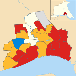 Map of the results of the 2010 Hull council election. Labour in red, Liberal Democrats in yellow, Conservatives in blue, Independent in grey, Uncontested in cream.