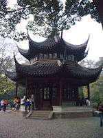 Also called the Pavilion of Exqusitiness, it is inspired by a verse by Su Shunqin, "Autumn drops in and tinges the dark woods red; moonlight pours down and grants the bamboo groves an exquisite look". It has a hipped gable roofline with flying eves. |