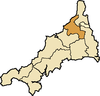 Some of the names of the hundreds ended with the suffix shire as in Pydarshire, East and West Wivelshire and Powdershire which were first recorded as names between 1184 and 1187.[1] In the Cornish language the word keverang (pl. keverangow) is the equivalent for English "hundred" and the Welsh cantref. The word, in its plural form, appears in place names like Meankeverango (i.e. stone of the hundreds) in 1580 (now The Enys, north of Prussia Cove and marking the southern end of the boundary between the hundreds of Penwith and Kerrier), and Assa Govranckowe 1580, Kyver Ankou c. 1720, also on the Penwith – Kerrier border near Scorrier. It is also found in the singular form at Buscaverran, just south of Crowan churchtown and also on the Penwith-Kerrier border. The hundred of Trigg is mentioned by name during the 7th century, as "Pagus Tricurius", "land of three war hosts".[2]