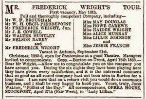 - ↑ The Era, 26 October 1889, p. 9. There was already an established comic actor in the English provinces with the name Walter Wright: see, e.g., The Era, 18 October 1884, p. 6 and 14 March 1885, p. 16, and so Wright used the stage names Walter Huntley, Huntley Wright and occasionally W Huntley-Wright: see The Era, 4 January 1890, p. 15