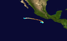 The newly formed depression moved very slowly due to weak steering currents aloft.[4] Moving towards the east-northeast over weak steering currents, the computer models used to predict the movement of the depression varied greatly, with one predicting an eventual Mexican landfall.[5] Located in conditions ideal for tropical development, the developing cyclone formed a central dense overcast, a large area of deep convection.[6] The depression steadily intensified to become Tropical Storm Adolph on May 26 about 225 mi (362 km) south-southwest of Acapulco. Adolph was in a low wind shear environment with warm sea surface temperatures and as such, the NHC forecasted intensification to hurricane status within two days.[7] Adolph turned northward on May 27, a turn influenced by a mid-level ridge building to the east and southeast,[8] thus causing the tropical storm to approach Mexico. A banding eye feature, a type of eye common in minor hurricanes, became apparent on satellite imagery. Convection around the eye deepened while the eye became more pronounced, and Adolph was upgraded to hurricane strength on May 27. On May 28, the hurricane passed within roughly 165 mi (265 km) of the Mexican coastline the next day, its closest approach to land. Shortly thereafter, Adolph turned westward under the influence of a mid-tropospheric ridge.[3] The high upper-oceanic heat content, good outflow, and lack of vertical shear[9] allowed the hurricane to begin a burst of rapid intensification, dropping 1.46 mbars per hour.[1] While reducing in size,[9] Adolph reached its peak strength of 145 mph (230 km/h) on May 29.[3] Dvorak classifications reported a T-number of 7.0 for Adolph, equivalent to a low-end Category 5 hurricane on the Saffir-Simpson Hurricane Scale.[1] However, because of a lack of data from the storm via Hurricane Hunters, these strength measurements may be disputed.[10]