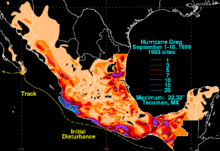 Both Hurricane Greg proper and its predecessor disturbance brought heavy rain to much of Mexico. The highest report was of 22.23 inches (566.9 mm) in Tecomán, Colima.[5] That makes Greg Mexico's Pacific hurricane with the sixth-highest point maximum and the Pacific hurricane with the ninth-highest point maximum overall.[6]