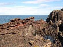 At Siccar Point, during the lower Silurian Llandovery Epoch around 435 million years ago, thin beds of fine-grained mudstone were laid down gradually deep in the Iapetus Ocean, alternating with thicker layers of hard greywacke formed when torrents swept unsorted sandstone down the continental slope. During the following 65 million years, the ocean closed and the layers of rock were buckled almost vertically, getting forced to the surface as the ocean floor was subducted under the northern continent. Erosion of the exposed edges of layers formed a characteristic shape of ribs of hard greywracke with narrow gaps where mudstone was worn away, and fragments of greywacke lay on the surface as a talus deposit. In the Famennian Late Devonian period around 370 million years ago this was a low-lying tropical area just south of the equator, where rainy season rivers deposited sands and silts rich in iron oxide, then during the dry seasons these were blown about by winds to form easily eroded layers and dunes. Over time these consolidated to form rocks; initially mixed with the greywacke fragments to form a basal conglomerate which has been defined as the Redheugh Mudstone Formation and dated by fossils of Bothriolepis hicklingi. Above this, layers of Old Red Sandstone formed the Greenheugh Sandstone Formation which is estimated to be around 170 metres (560 ft) thick. This in turn was uplifted above the sea, tilting to a shallow slope, then eroded in places such as Siccar Point to expose the underlying layers.[14][15]