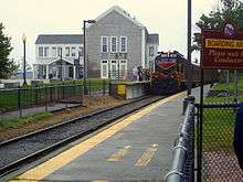 A Cape Cod Central Railroad train at the Hyannis Transportation Center station. The train is picking up passengers there because boarding using the lower platform of the Cape Cod Central's station (in the foreground) requires climbing stairs.