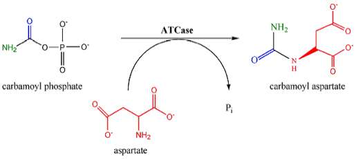 EC 2.1 includes enzymes that transfer single-carbon groups. This category consists of transfers of methyl, hydroxymethyl, formyl, carboxy, carbamoyl, and amido groups.[31] Carbamoyltransferases, as an example, transfer a carbamoyl group from one molecule to another.[32] Carbamoyl groups follow the formula NH2CO.[33] In ATCase such a transfer is written as Carbamyl phosphate + L-aspertate L-carbamyl aspartate + phosphate.[34]