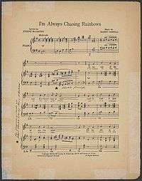 "I'm Always Chasing Rainbows" is a popular Vaudeville song. The music is credited to Harry Carroll, although the melody is actually adapted from Fantaisie-Impromptu by Frédéric Chopin. The lyrics were written by Joseph McCarthy, and the song was published in 1917 and introduced in the Broadway show Oh, Look! which opened in March, 1918.[1] The song was sung in the show by The Dolly Sisters.[1] Judy Garland sang it in the 1941 film Ziegfeld Girl. It was subsequently sung by Jack Oakie in the 1944 film The Merry Monahans and was again featured in the 1945 film The Dolly Sisters (1945 in film), where it was sung by John Payne.[1] It was also included for part of the run (and in the cast album) of the 1973 revival of Irene.